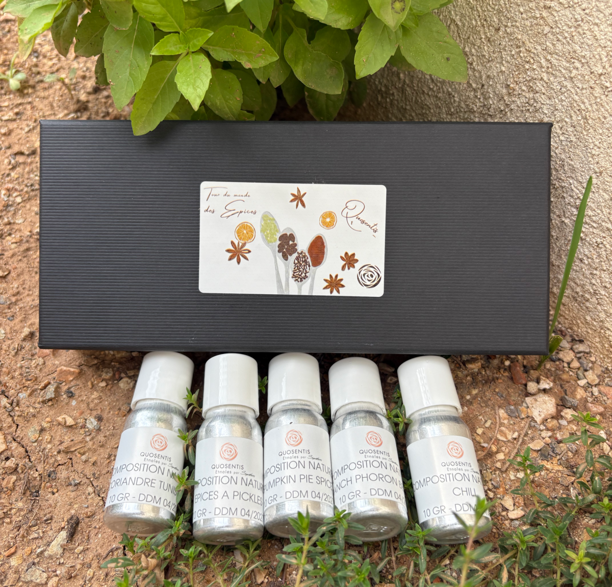 Le coffret « Tour du monde des épices » propose une composition épices à Pickles, une composition chili, une composition coriandre tunisienne, un mélange pumpkin pie spice et un mélange panch phoron bengali pour sublimer ou aromatiser vos plats.